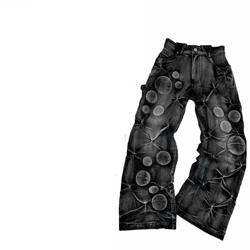 Heavy-wash Faded And Distressed Loose-fit Embroidered Casual Padded Pants