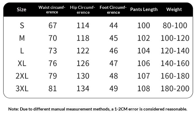 Pants sizes: S, M, L, XL, 2XL, 3XL